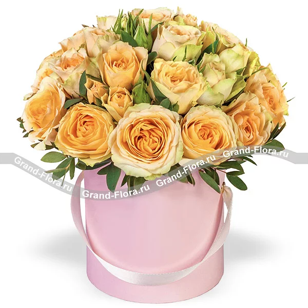 25 роз: роза кремовая - 25 шт., шляпная коробка круглая розовая - 1 шт., оазис.